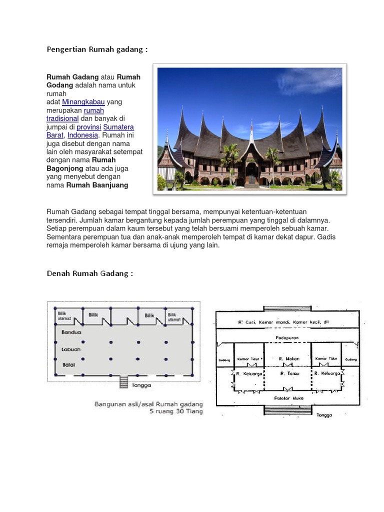 Denah rumah gadang. Rumah Gadang merupakan rumah tinggal bagi kaum Minangkabau. Bentuk atapnya punya bubungan yang lengkung ke atas yaitu lebih kurang setengah lingkaran. Selain itu perawatan dan pemeliharaan Rumah Gadang semakin berkurang.